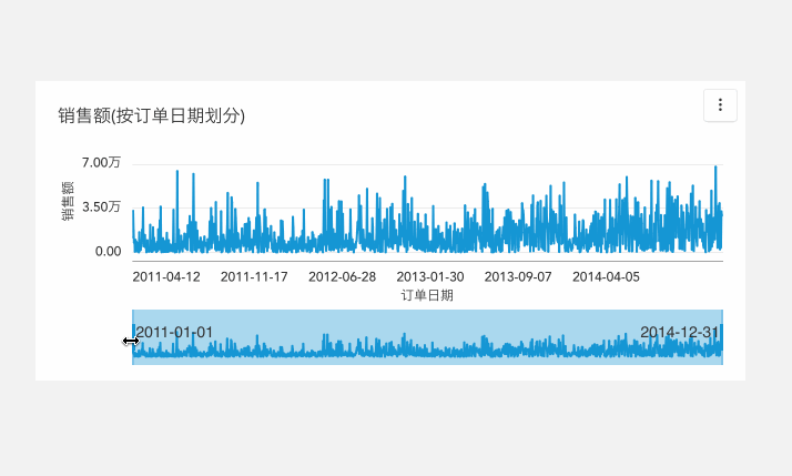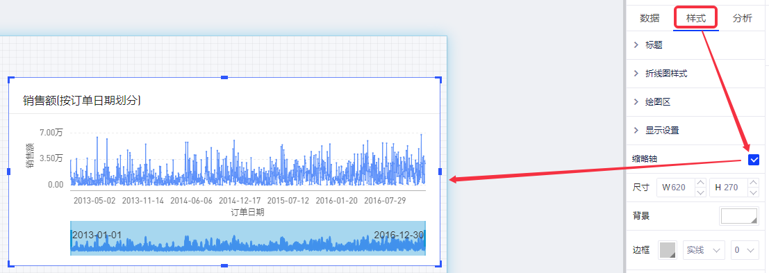 选中图表,选择右侧配置区的样式tab,点击选中缩略轴,即完成缩略轴的设置。缩略轴拖动时,会显示两端的值。