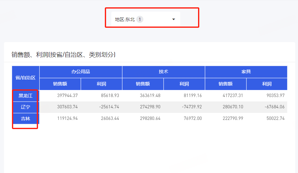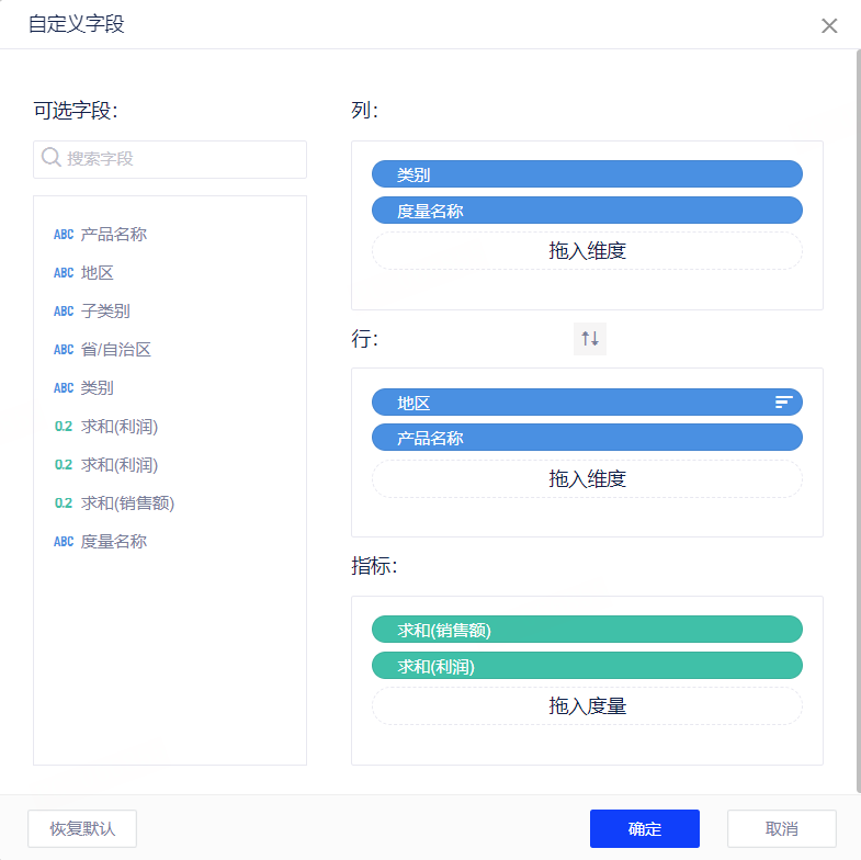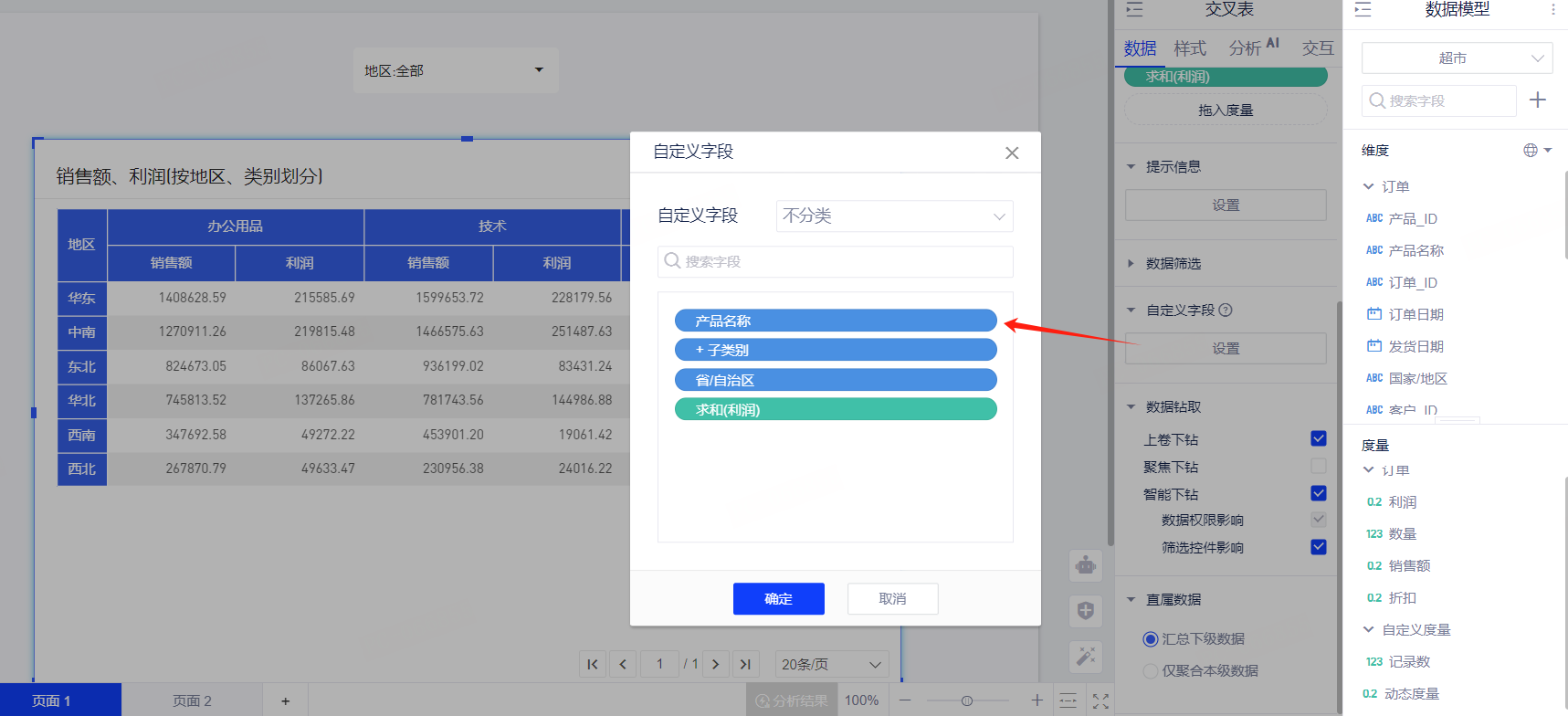 以默认数据模型为例,查看各地区的产品销售额、利润、数量,将涉及到4个字段:维度“类别”、“地区”,度量“销售额”、“利润”、“数量”。