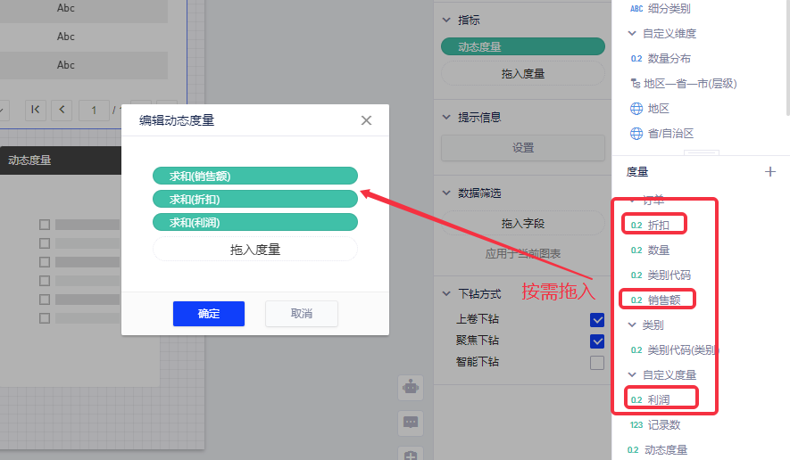 (3)在字段配置区选中“动态度量”,点击下拉菜单(也可右键呼出)后选择【编辑】,将需要计算的度量依次拖入弹窗内,然后点击确定;