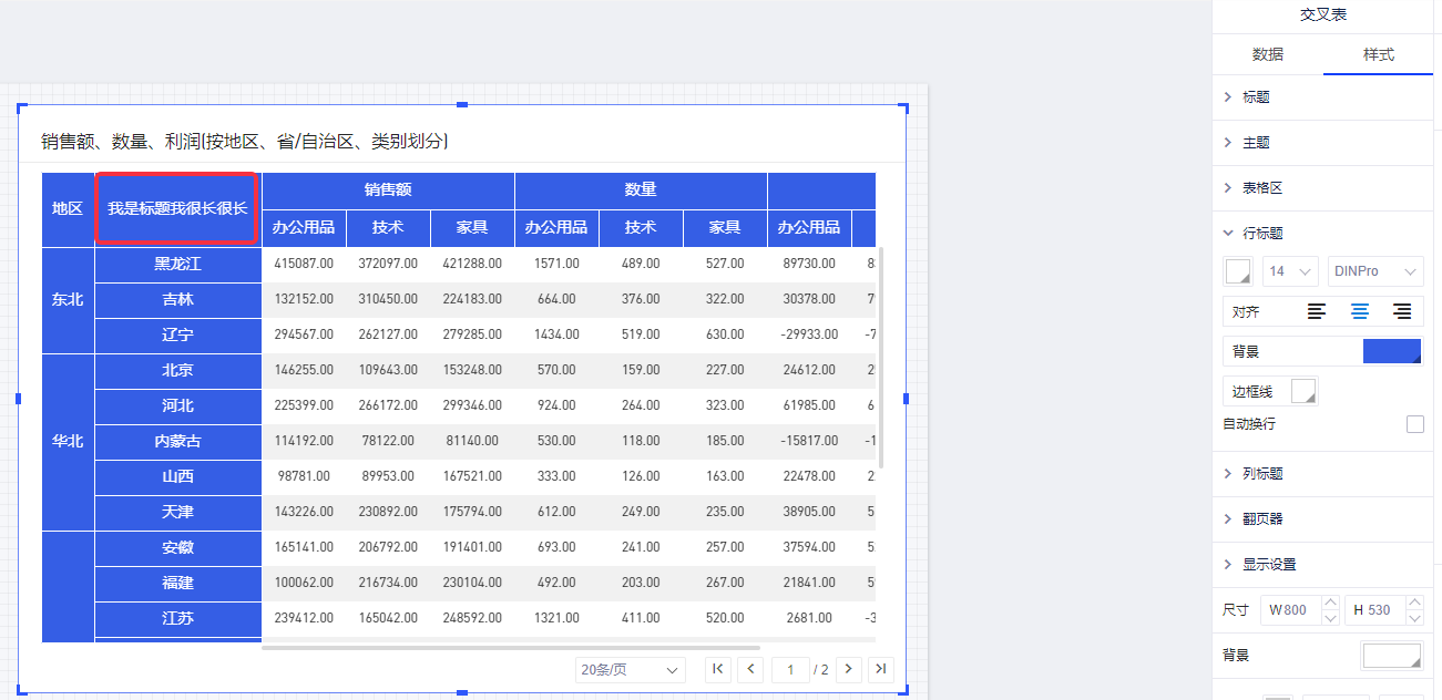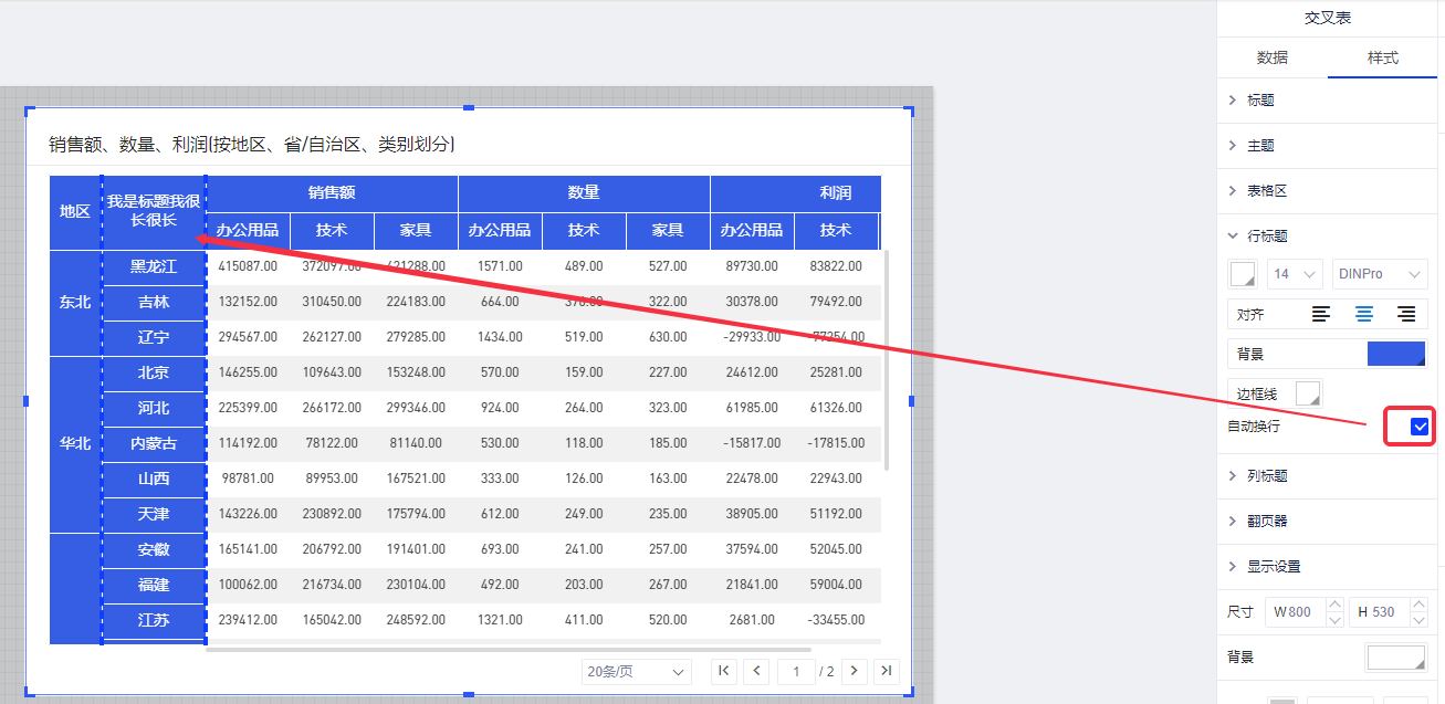 (2)选择【交叉表】-【样式】-【行标题/列标题】-【自动换行】,则当标题过长时会自动换行;