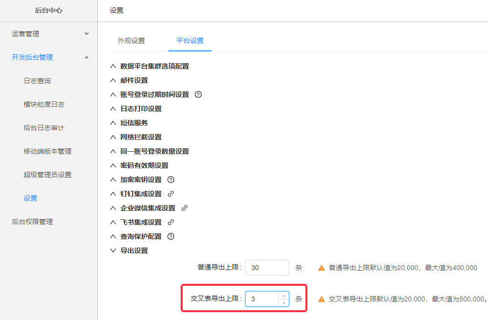 可至【后台管理】-【设置】-【平台管理】-【导出设置】设置导出上限(该设置适用于私有化部署版本,SaaS版本不支持)。