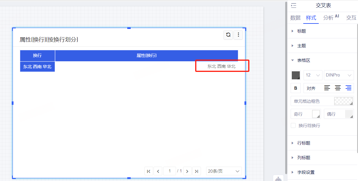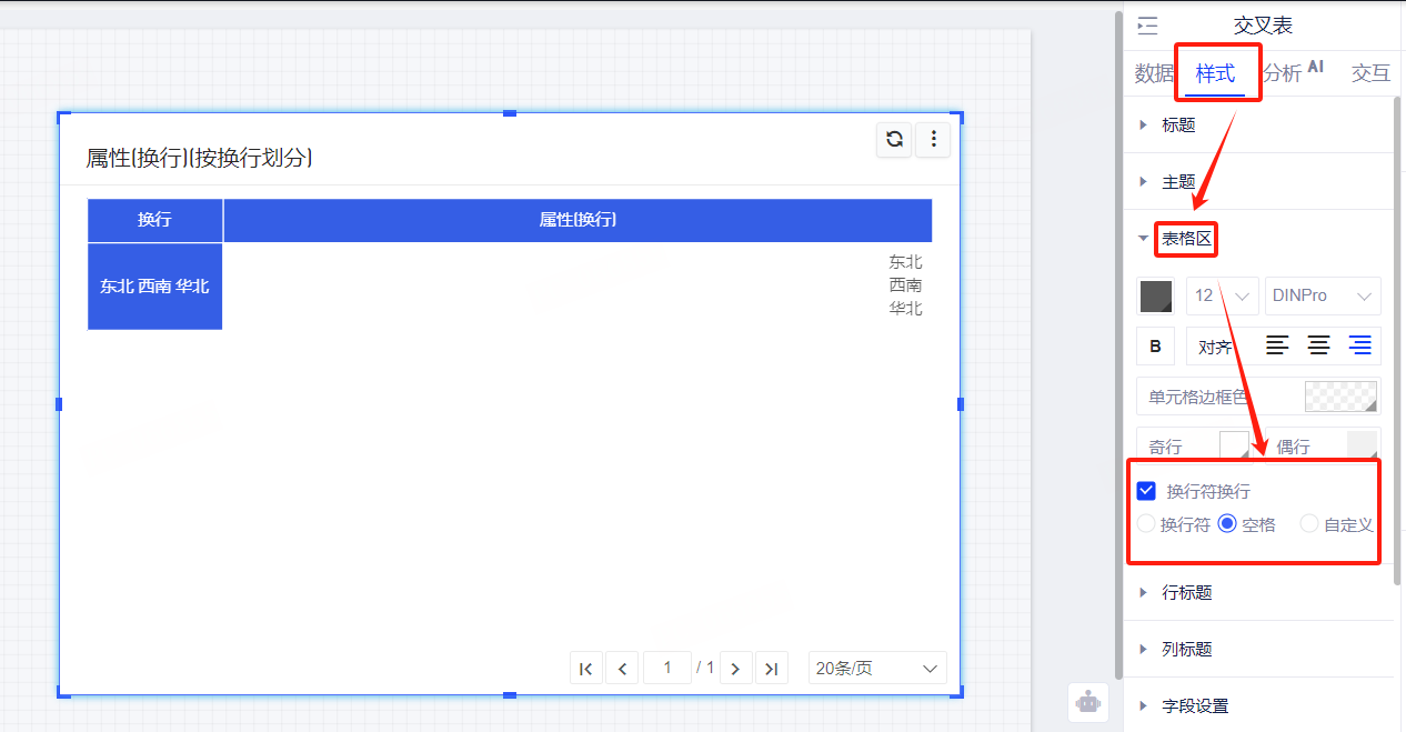 (3)选择【交叉表】-【样式】-【表格区】-【换行符换行】,根据换行符换行;