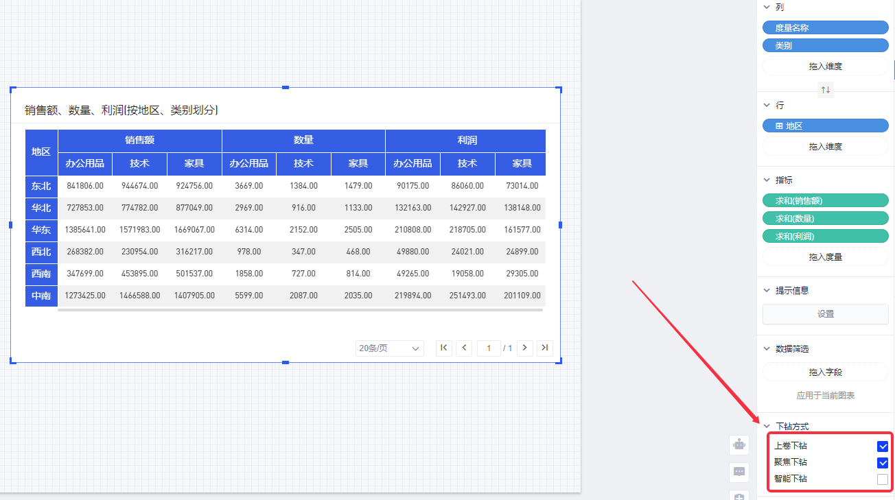 上卷下钻:在当前界面展示原有维度和下钻的维度。