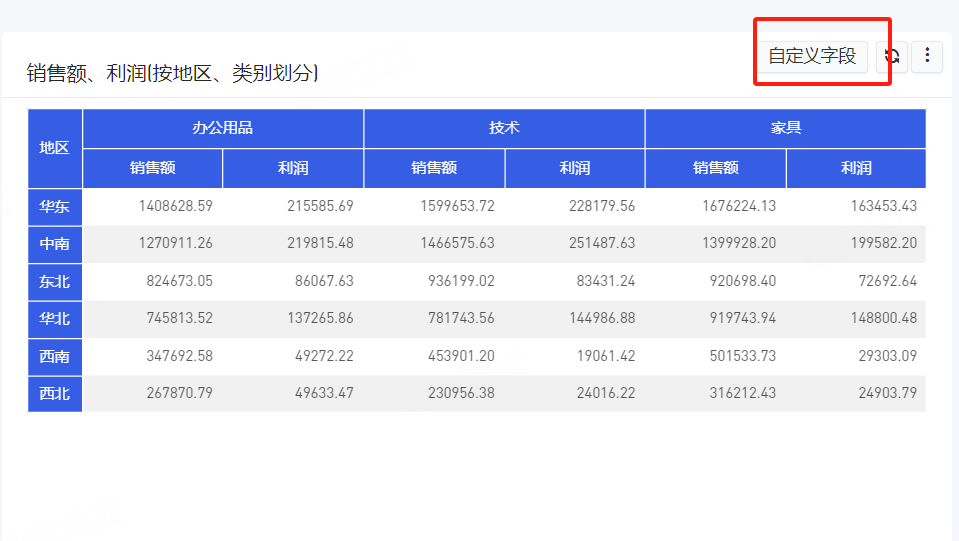 不同业务人员关注的指标不一样,报告制作人制作的表格可能不完全是业务人员关注的指标。这时报告制作人可将部分字段放入自定义字段中,由阅览者根据提供字段列表自行分析查看数据。