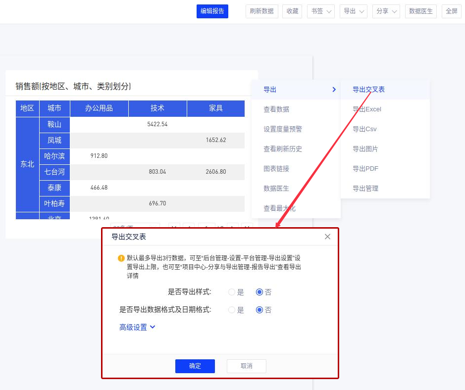 设置后,导出交叉表数据量若超限则会有上限提示。