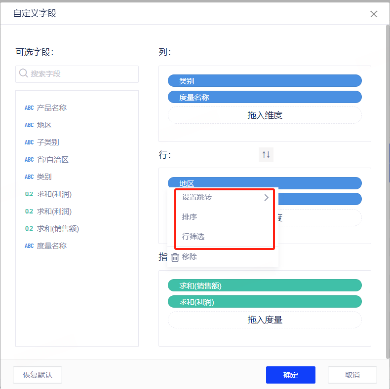 (2)隐藏字段:列、行均支持隐藏字段,操作入口如下图所示。