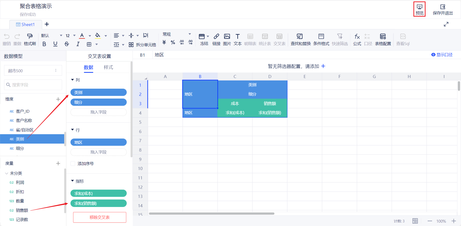 1. 概述2. 快速入门1. 概述交叉表可以显示表中某个字段的汇总值,并对同类数据合并。行和列的交叉处可以对数据进行多种汇总计算,例如求和、平均值、记数、最大值和最小值。 2. 快速入门(1) 产品入口 操作方式1:顶部工具栏“交叉表”--> 选择作用数据范围(M*1)--> 确定。操作方式2:选择数据作用范围(M*1)--> 顶部工具栏“交叉表”。 (2) 制作交叉表 将维度拖入行、列,支持拖入多个维度。将度量拖入指标区域,支持拖入多个度量,多个度量将会以行的形式存在。 点击上图中的“预览”对报表进行查看。