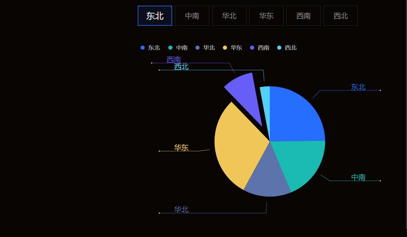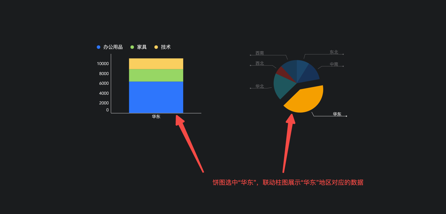 有一类常见的图表联动场景,比如下图,饼图选中某个地区,联动柱图展示对应地区的数据。