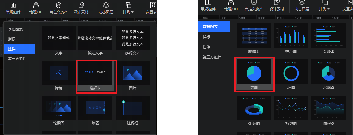 1.在大屏中选中“选项卡”和“饼图”组件。