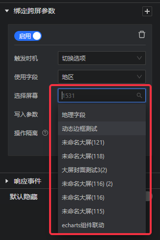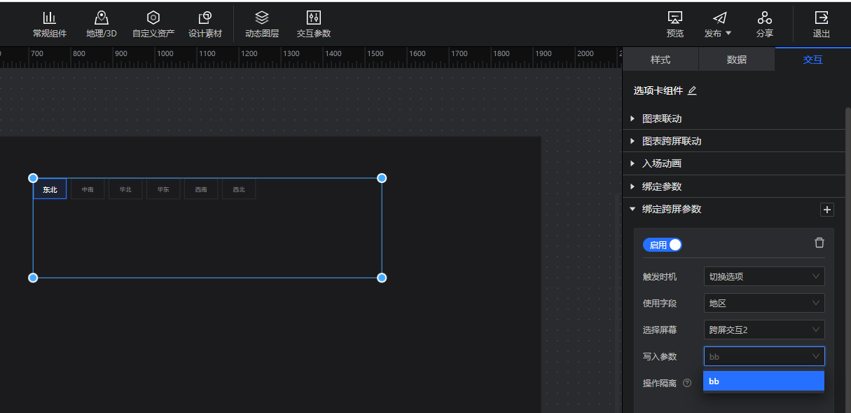- 如下图所示,组件的“交互”模块里增加了“绑定跨屏参数”设置,可选择将字段值传递至其他大屏的交互参数;
