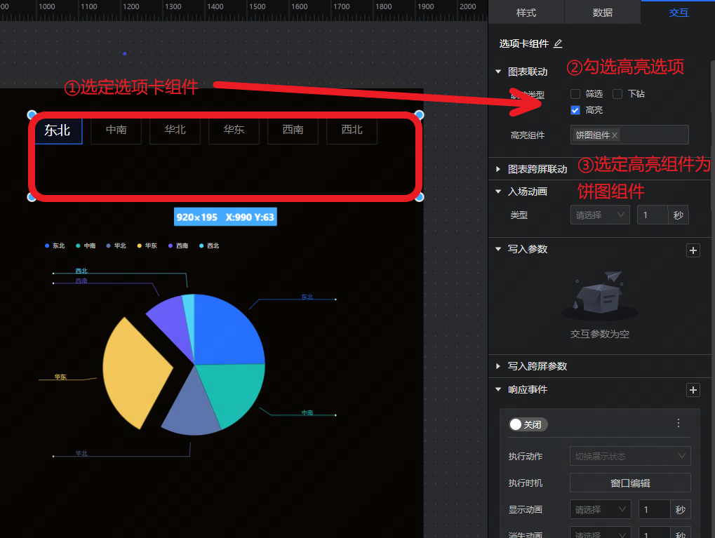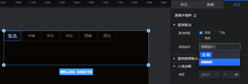 3.点击选项卡,在“交互”Tab下选择筛选,并将筛选组件选定为“饼图组件”。