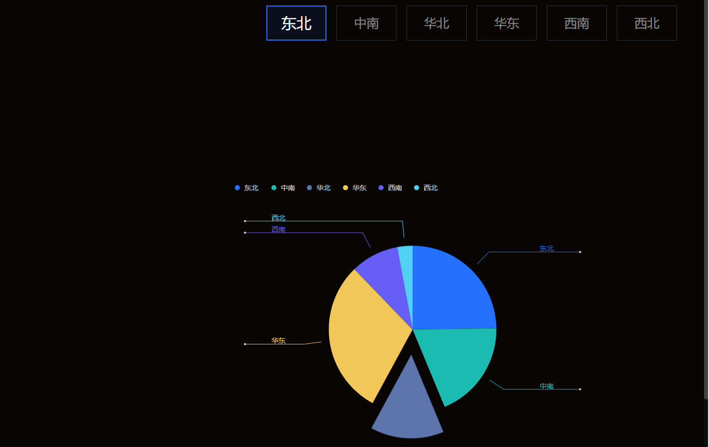 4.此时,我们在大屏中点击选项卡中某一地区,饼图会同时触发此地区的筛选。