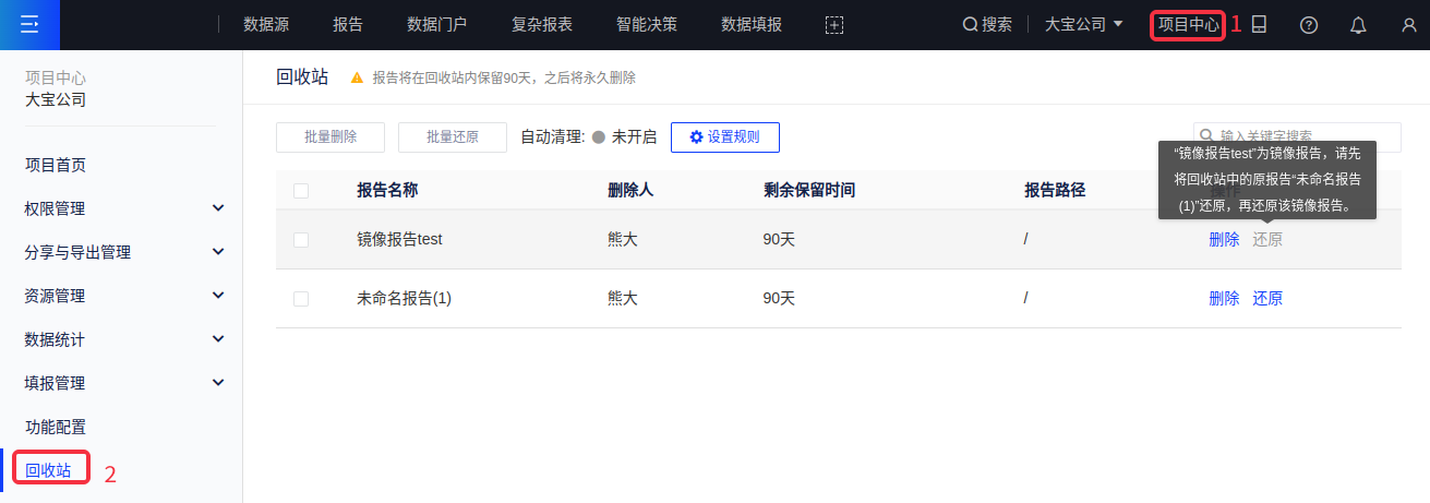删除镜像报告时,和普通报告一样会进行回收站,但是回收站中镜像报告的还原与删除操作依赖于原报告的状态,且镜像报告不允许添加至回收站的白名单中。删除原报告时,会同步删除其镜像报告,二者一起进行回收站中。