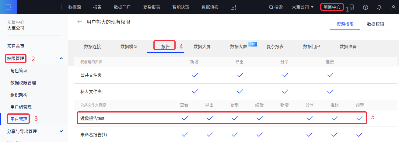 镜像报告的权限管理同产品中的其他普通报告,通过创建角色,给角色赋权的方式来管理。不同之处在于,拥有镜像报告编辑权限的用户实际上并不能对镜像报告进行编辑,而是通过跳转到原报告的阅览页面进行编辑操作。若某用户没有原报告的编辑权限,实际上仍不能对原报告进行编辑,进而无法编辑镜像报告的内容。