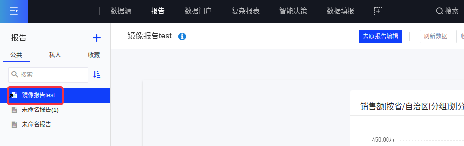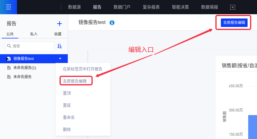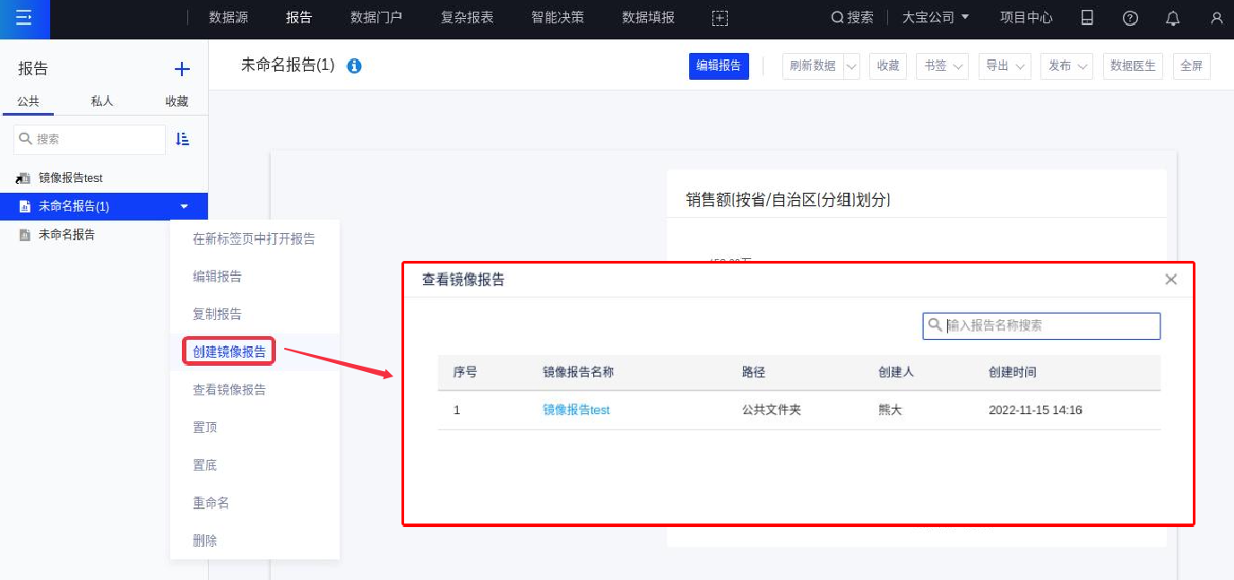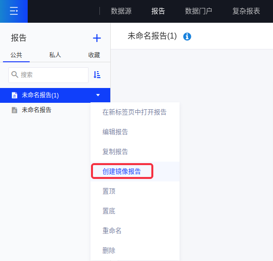 (1)创建镜像报告前请确认您对原报告具有编辑权限,如果有则点击该报告下拉按钮选择[创建镜像报告];