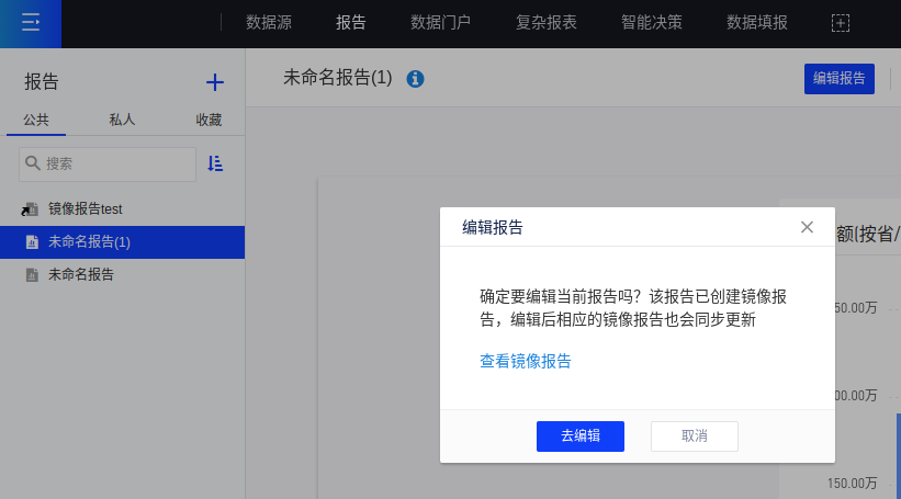 编辑原报告时,弹窗提示是否要继续操作,镜像报告会同步更改,可点击查看镜像报告,显示镜像报告名称、路径、创建人、创建时间。
