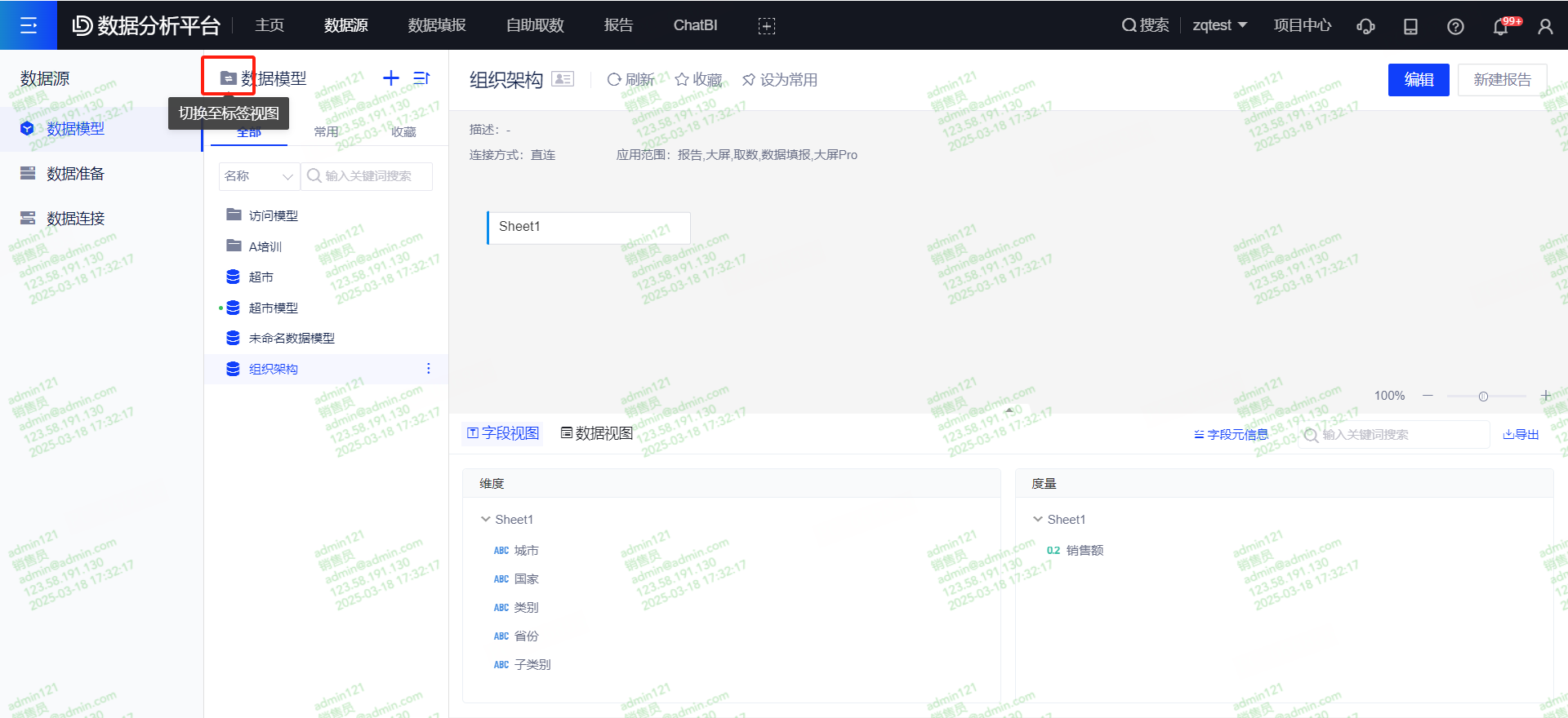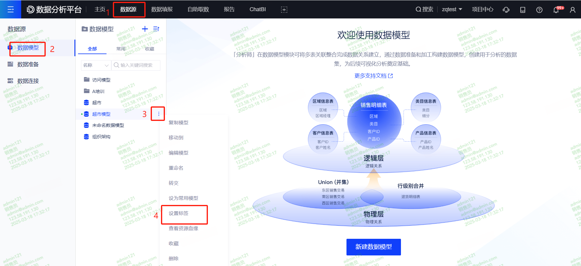 (2)点击【数据源】-【数据模型】,选中需要设置模型,右键呼出菜单栏,选择设置标签,可给模型添加标签,一个模型可绑定多个标签。