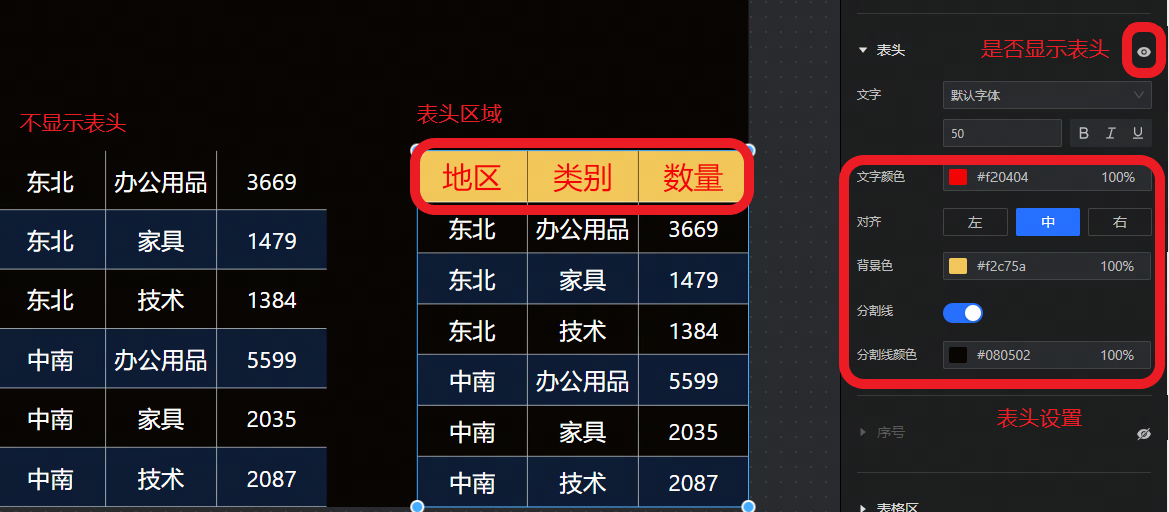 表头:设置是否显示表头,以及文字样式、对齐、背景色、分割线样式。