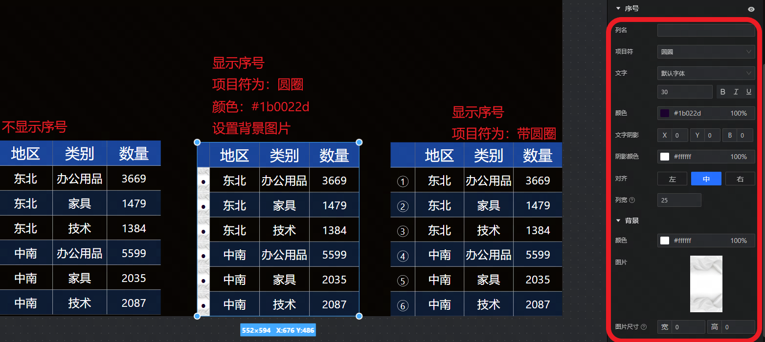 序号:设置是否显示序号、以及列名、项目符、文字样式、对齐、列宽。