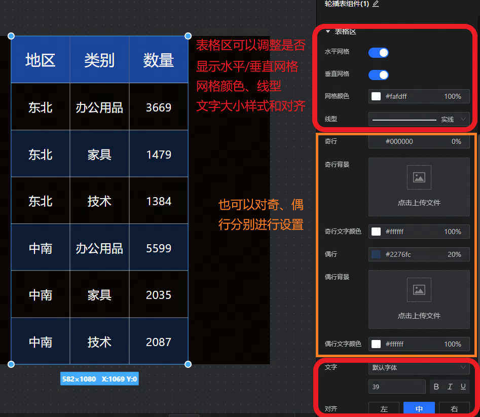 表格区:设置网格方向、颜色、线型、文字、对齐。
