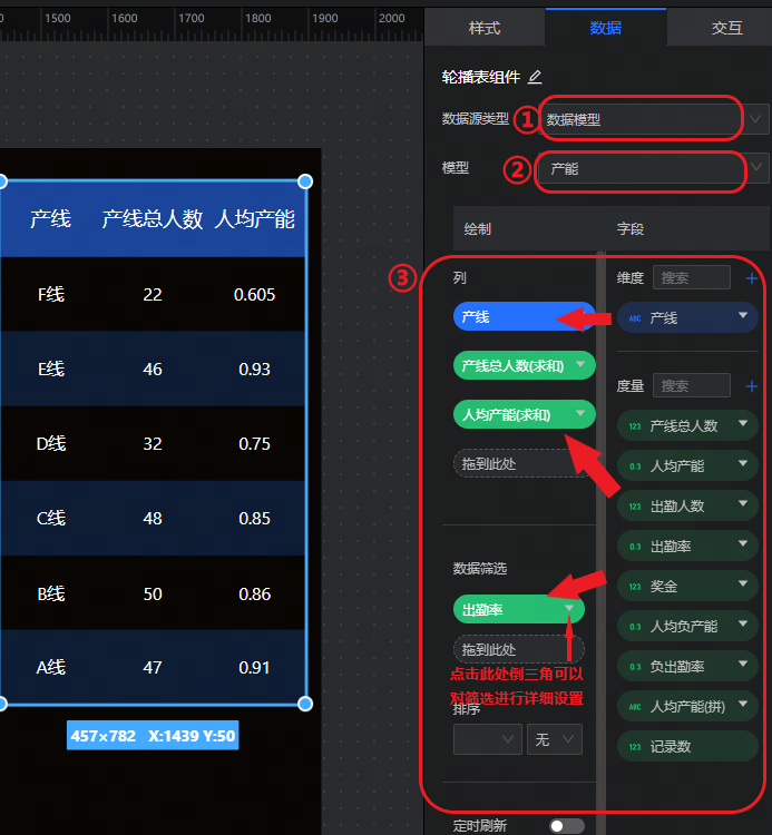 3.用户可根据需要将字段拖入左侧“列”和“数据筛选”下,进行数据配置。