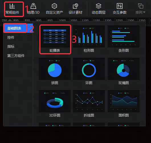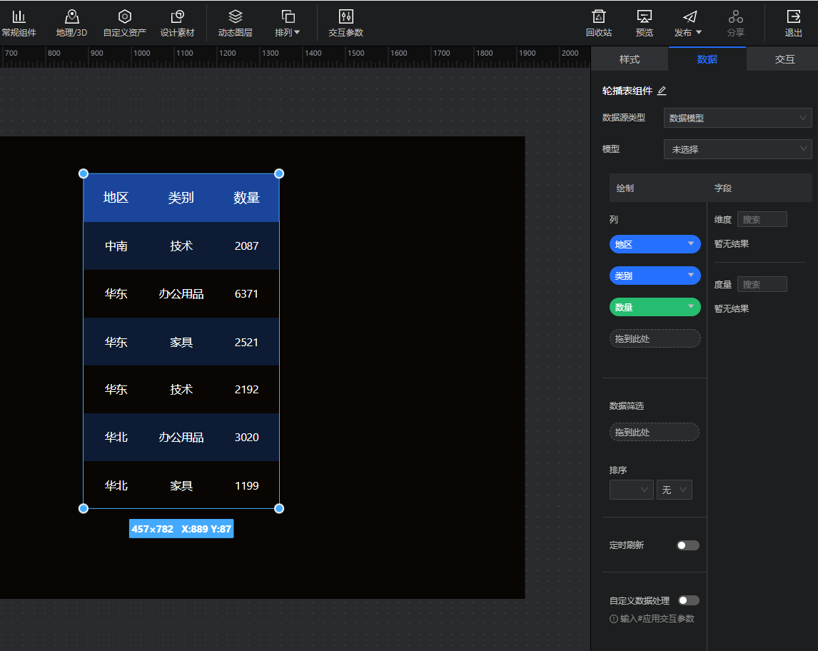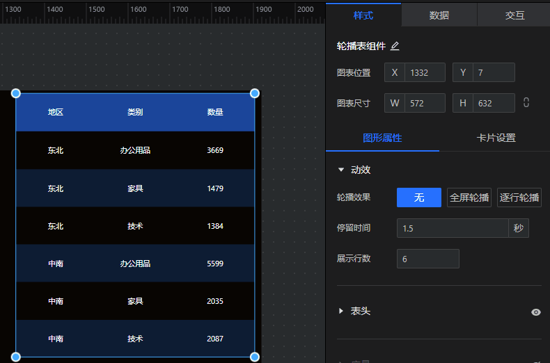 在编辑状态下点击轮播表组件即可对其进行配置,配置内容分为样式、数据和交互三个Tab。(本节仅介绍轮播表特有属性的配置,基础图表共性的配置请参考下文"组件配置")