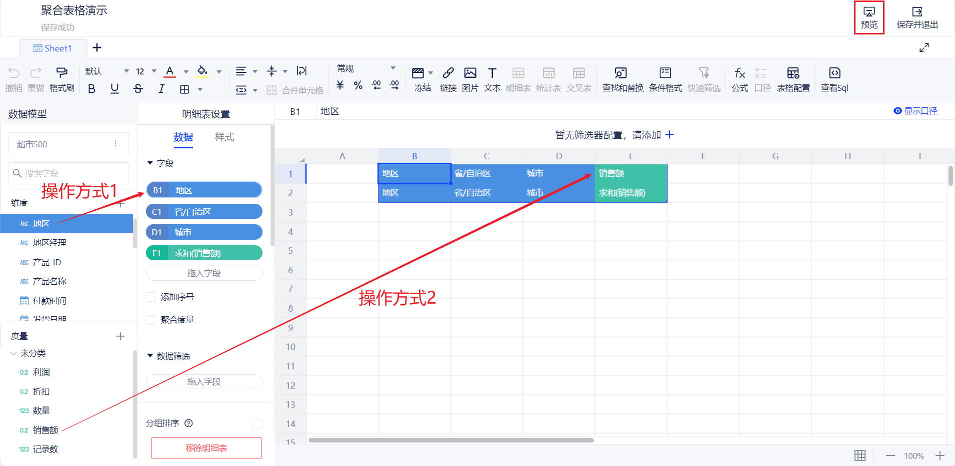 - 操作方式1:将字段拖入当前明细表范围内指定单元格。