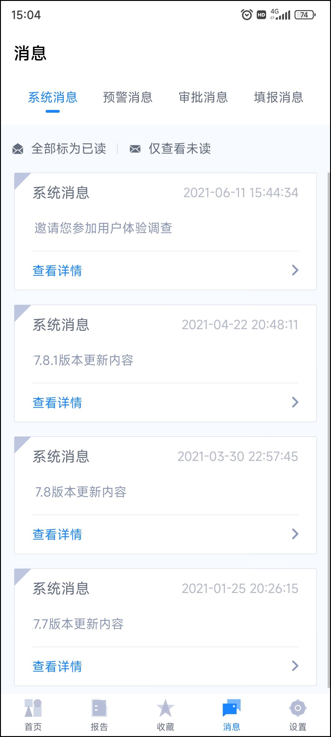 【消息】tab页展示了与桌面端同步的系统消息、预警消息和审批消息,可将其标记为已读或近查看未读消息,也可手动删除消息。