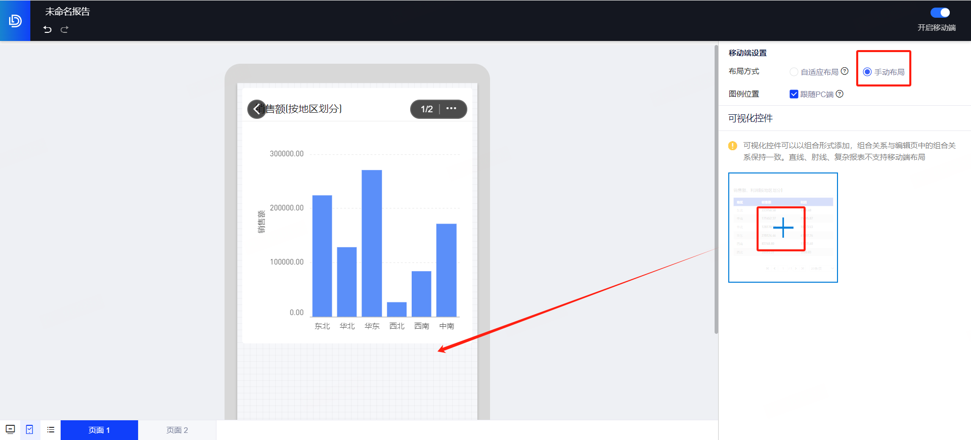 对于已经创建的桌面端报告,可以使用【手动布局】的功能,点击加号按钮依次将图表添加到画布区,手动拖动图表进行移动端布局及尺寸大小配置。