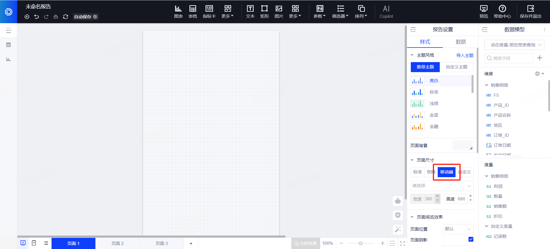 (1)当您创建一个新报告后,可先将页面尺寸设置为【移动端】,即可按照移动端的页面尺寸进行报表的编辑与布局;