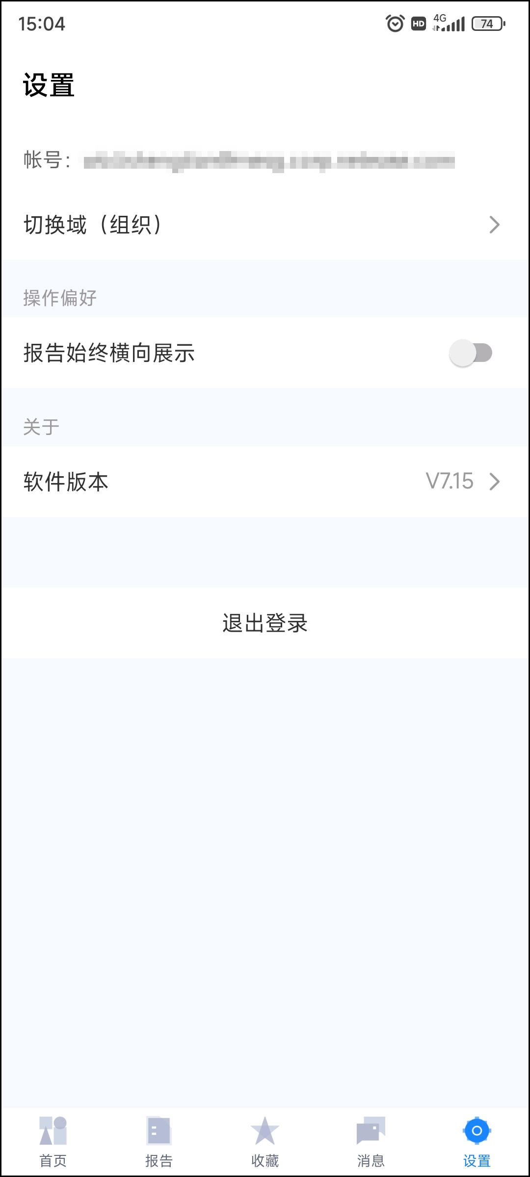 【设置】tab页可看到账号及软件当前版本号,进行切换域(组织)及退出登录等操作。