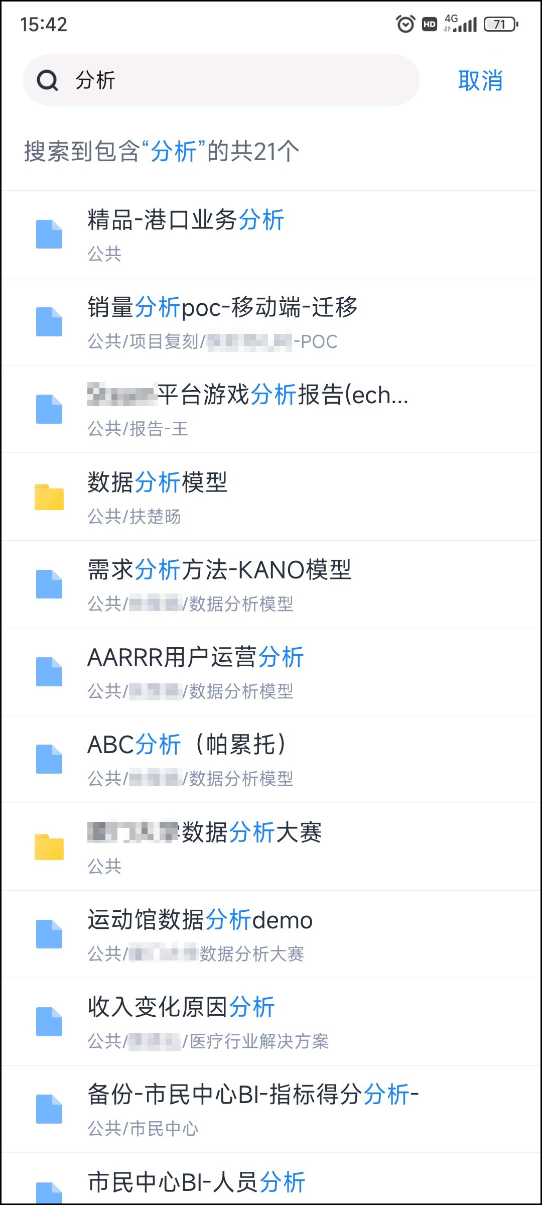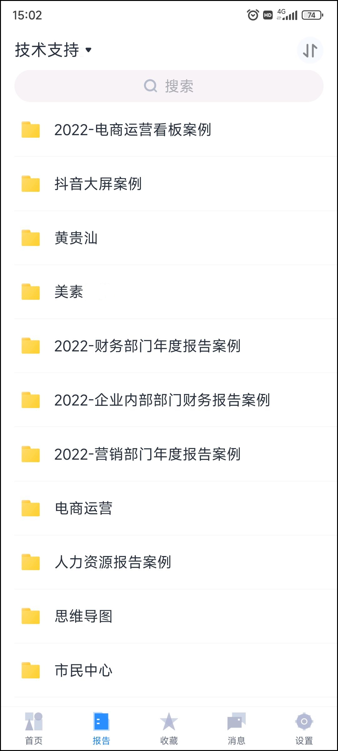 报告tab页分公共文件夹和私人文件夹,展示了所有您已发送到移动端的报告,各文件夹及报告的分布与桌面端保持一致。顶部可切换项目,查看各个项目下的文件夹和报告。