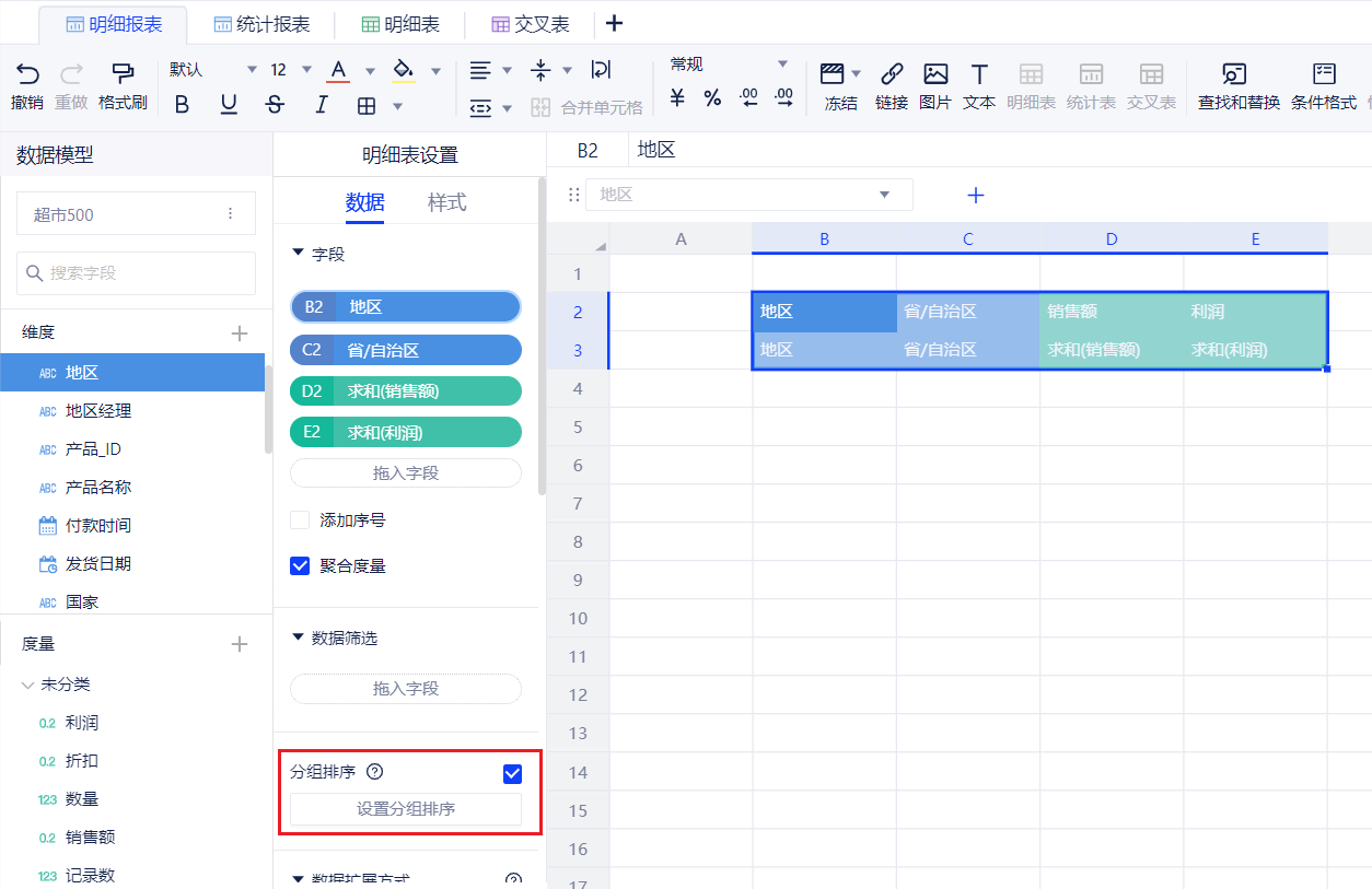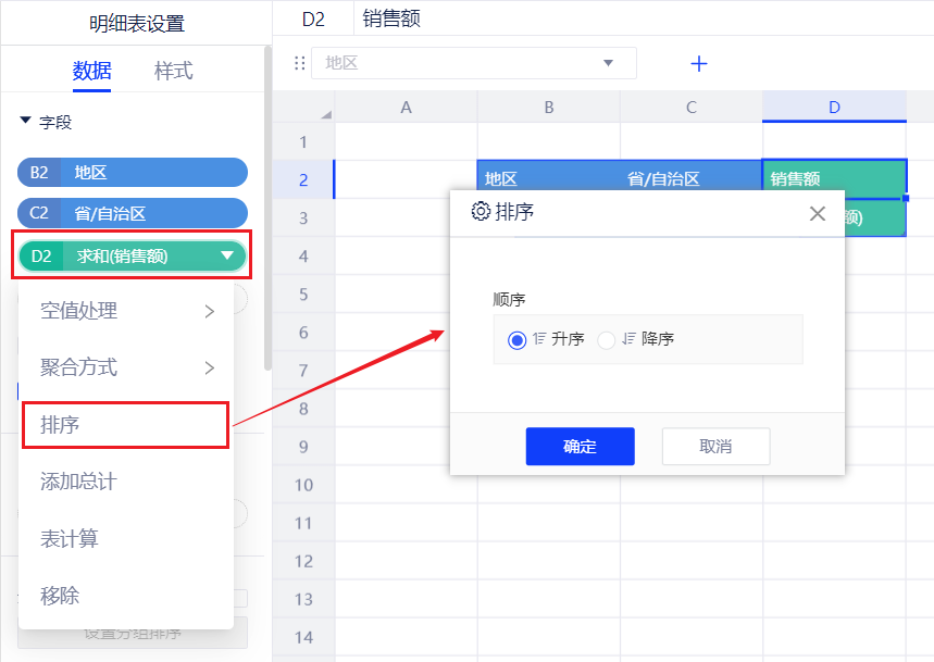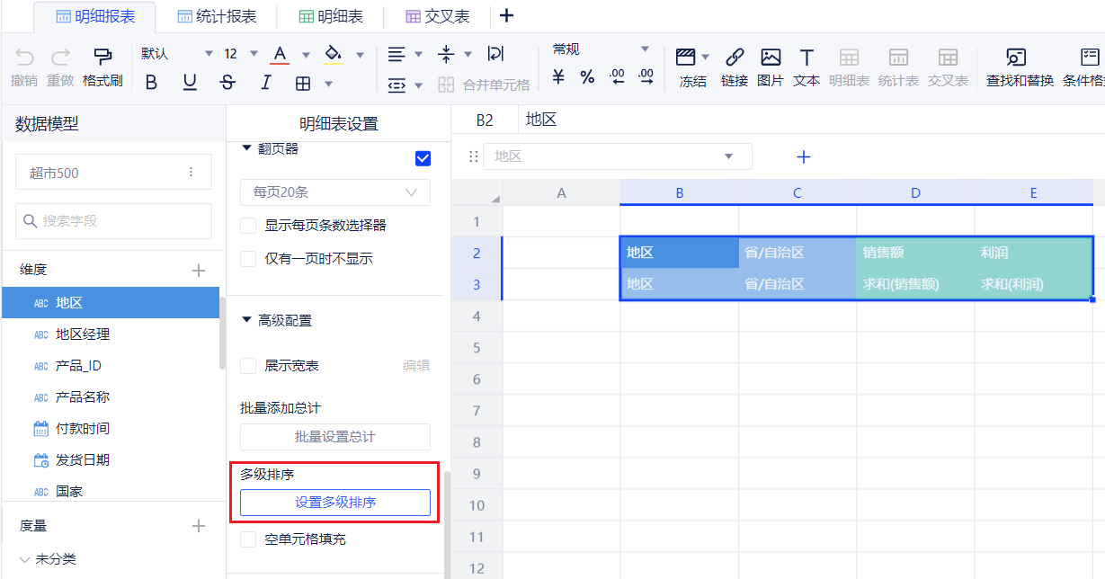 根据某个字段对明细表或交叉表进行排序。此外,明细表还支持分组排序以及多级排序。
