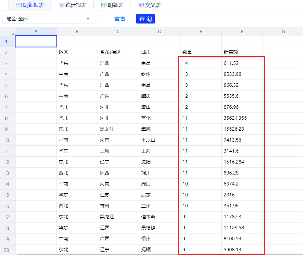 多级排序示例:按数量、销售额均降序,且数量优先级更高进行分级排序。