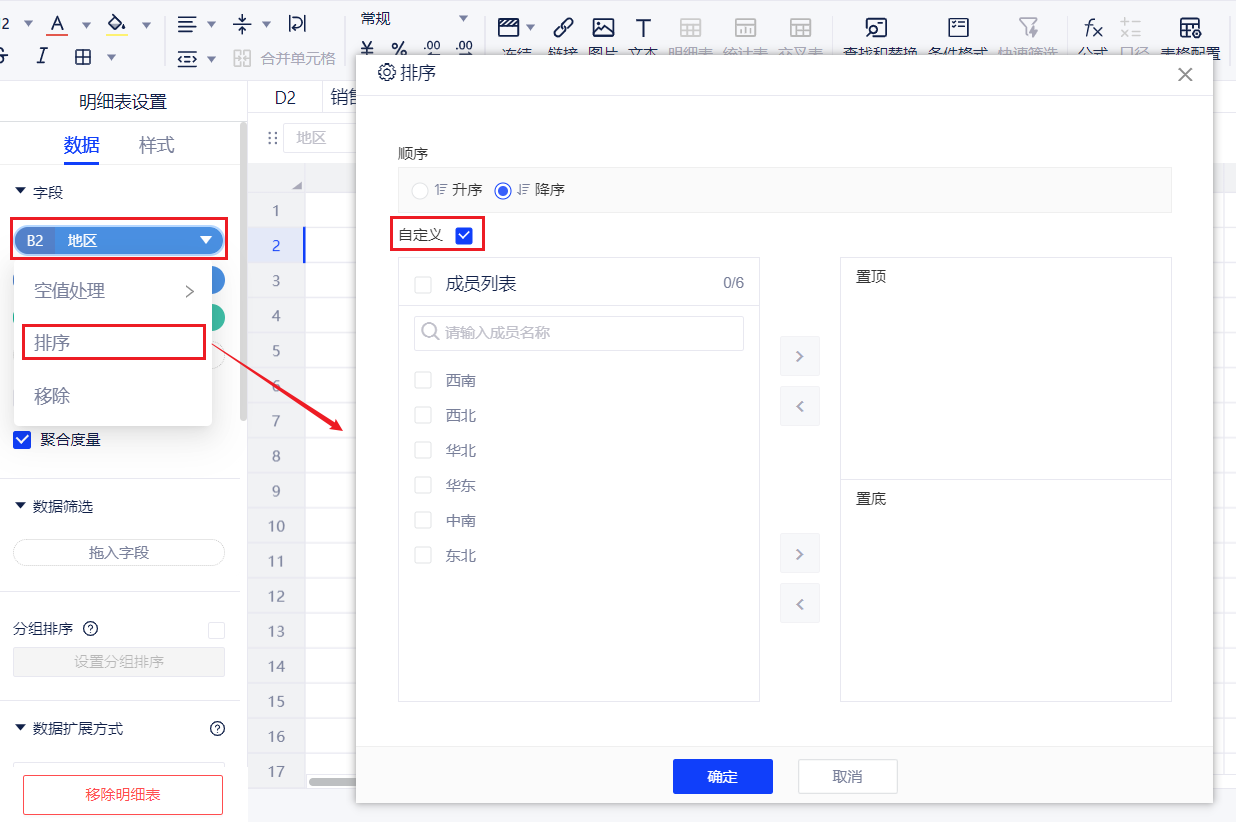 - 对于维度字段,支持升序排序或降序排序,也支持自定义排序,可以将指定字段置顶或置底。
