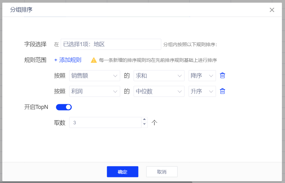 规则范围:可对多个字段同时进行配置, 每一条新增的排序规则均在先前排序规则基础上进行排序。