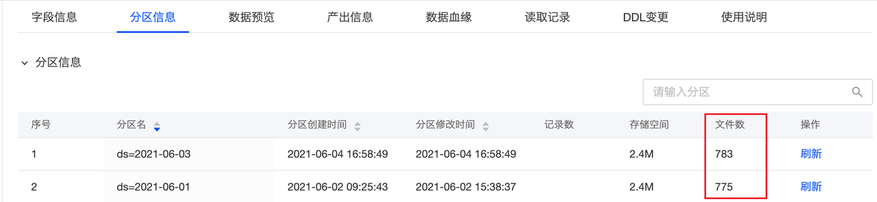 如果是分区表,则可以在“分区信息”看到具体分区的文件数:
