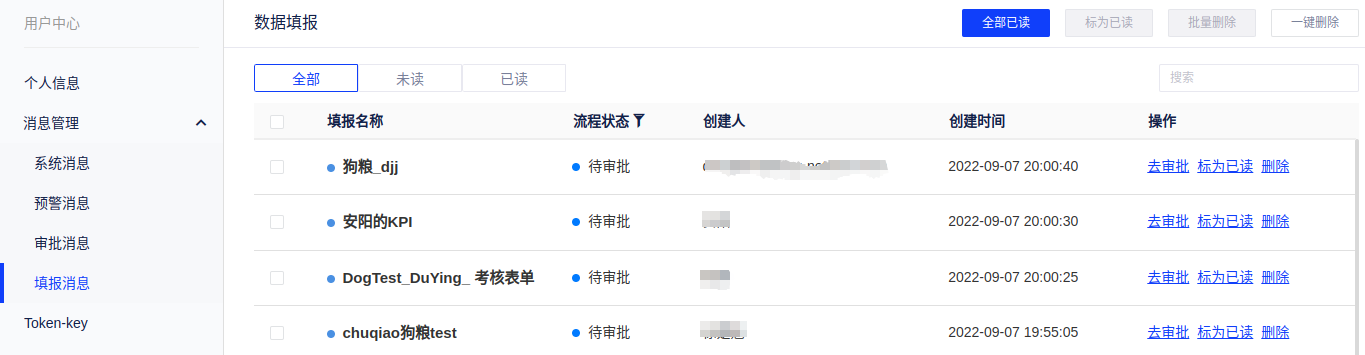 - 填报消息:填报审批、通知消息