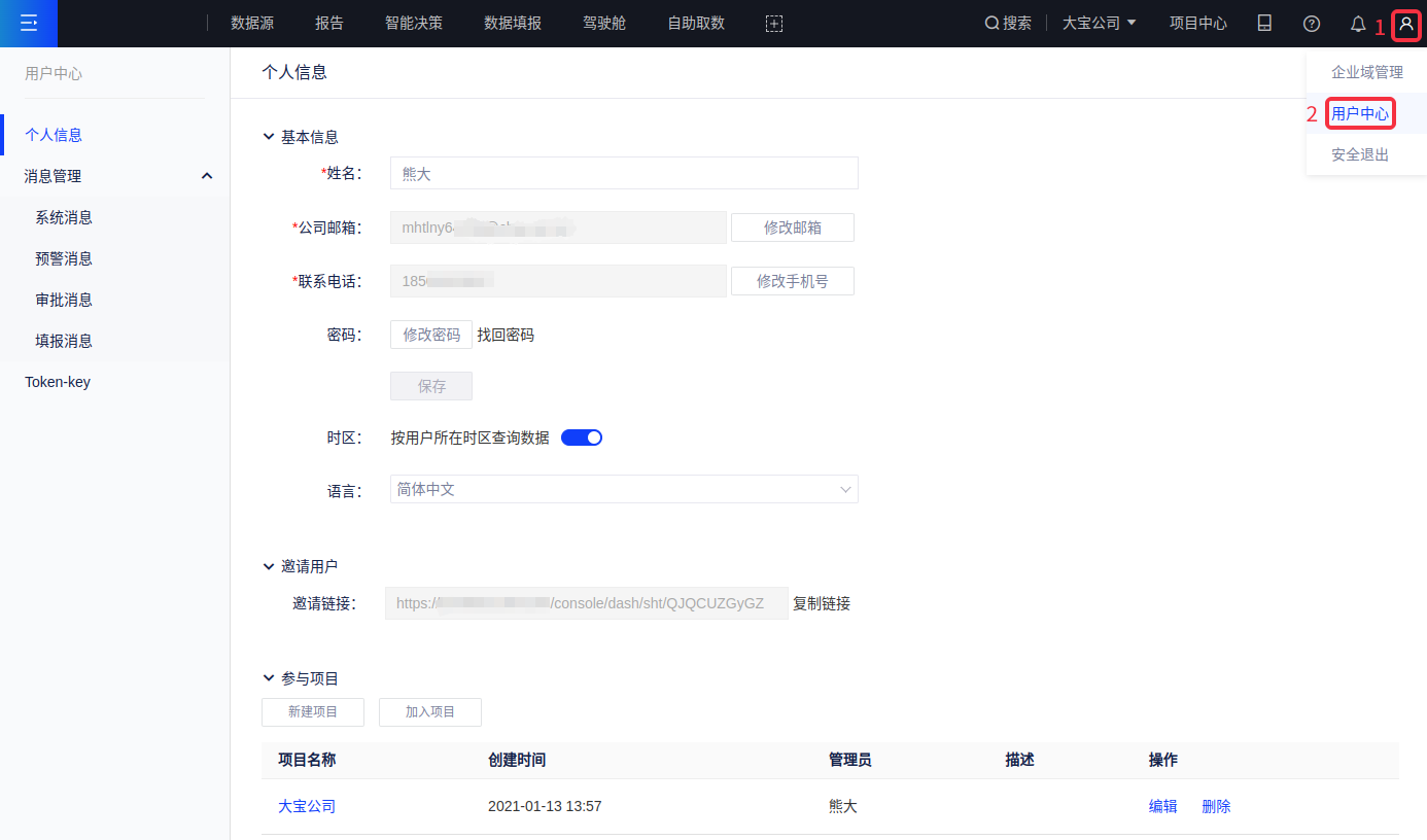 (1)在基本信息模块,可以修改设置您的姓名、邮箱、电话、密码、时区(默认为东八区,开启后将按您当地时间进行查询)、语言(简体中文、English)等基础资料;