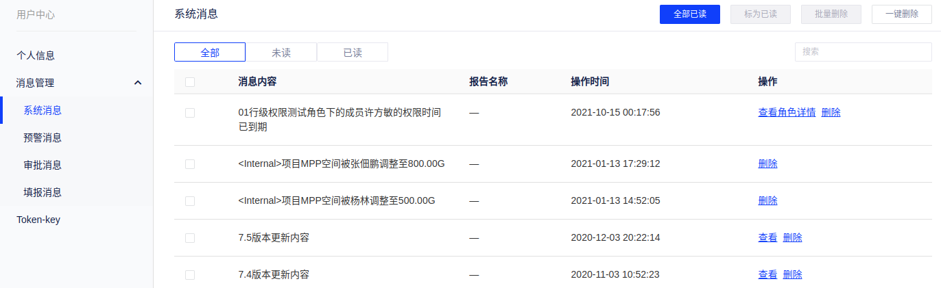 - 系统消息:如版本更新、项目信息变动、权限到期通知等