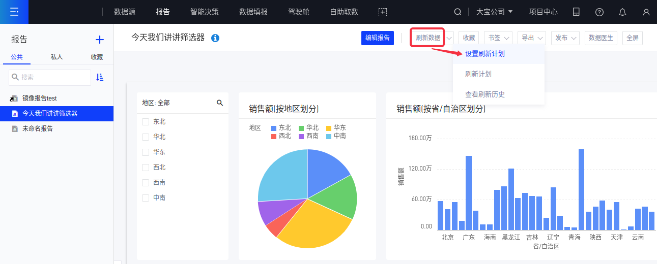 (1)在报告阅览状态下,点击报告右上角“刷新数据”右侧的下拉按钮,在弹出的菜单列表内可以看到“设置刷新计划”的按钮。