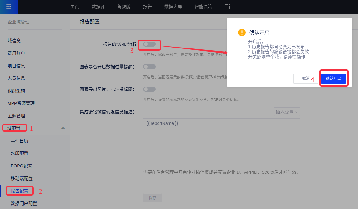 该功能默认为关闭状态,您可在【企业域管理/平台管理-域配置-报告配置-报告发布】(需要域管理员或域主账号)中开启报告发布功能,如下图所示: