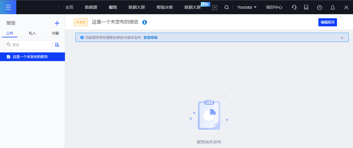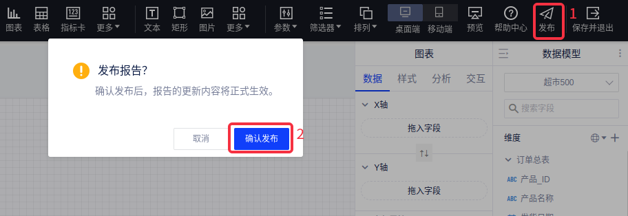 您可以多次修改、保存报告后再进行发布,在编辑页面右上角可以看到“发布”按钮。