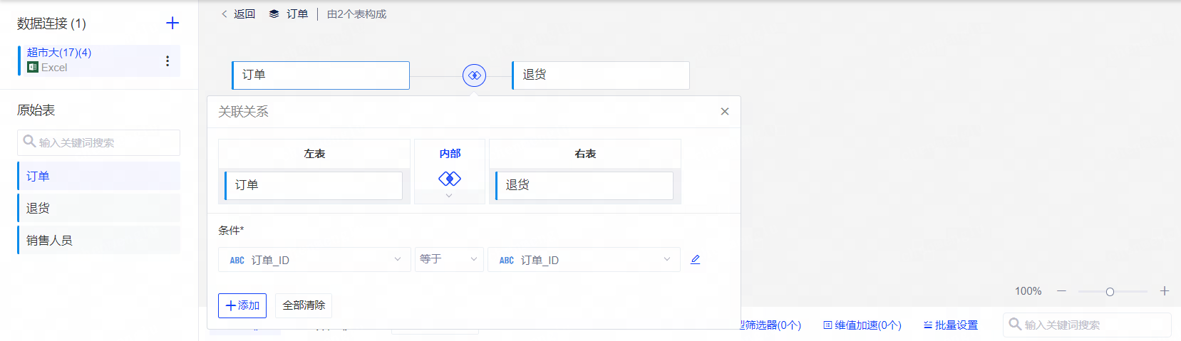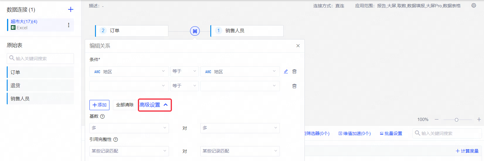 关联时,您可以在此处配置逻辑表的基数和引用完整性。例如下图,“订单表”和“销售人员表”关联时,基数用来度量“订单表”中,公共字段“地区”的值在“销售人员表”中可以对应的行的数量;引用完整性用来度量“订单表”的行在“销售人员表”中是否具有匹配行。