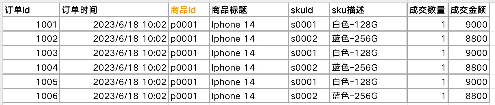 因为表1是订单粒度的,同一个商品id存在多笔订单,一个商品id会对应多条记录。而表2是商品粒度的,一个商品id只会有一条记录。两个表用商品id进行关联(Join)后,表2中的曝光PV指标就会产生膨胀——“p0001”这个商品id在表1中出现过6次,表2中的曝光pv数据汇总后就会放大6倍(如下图),这样计算得到的GPM则会比真实值小很多: