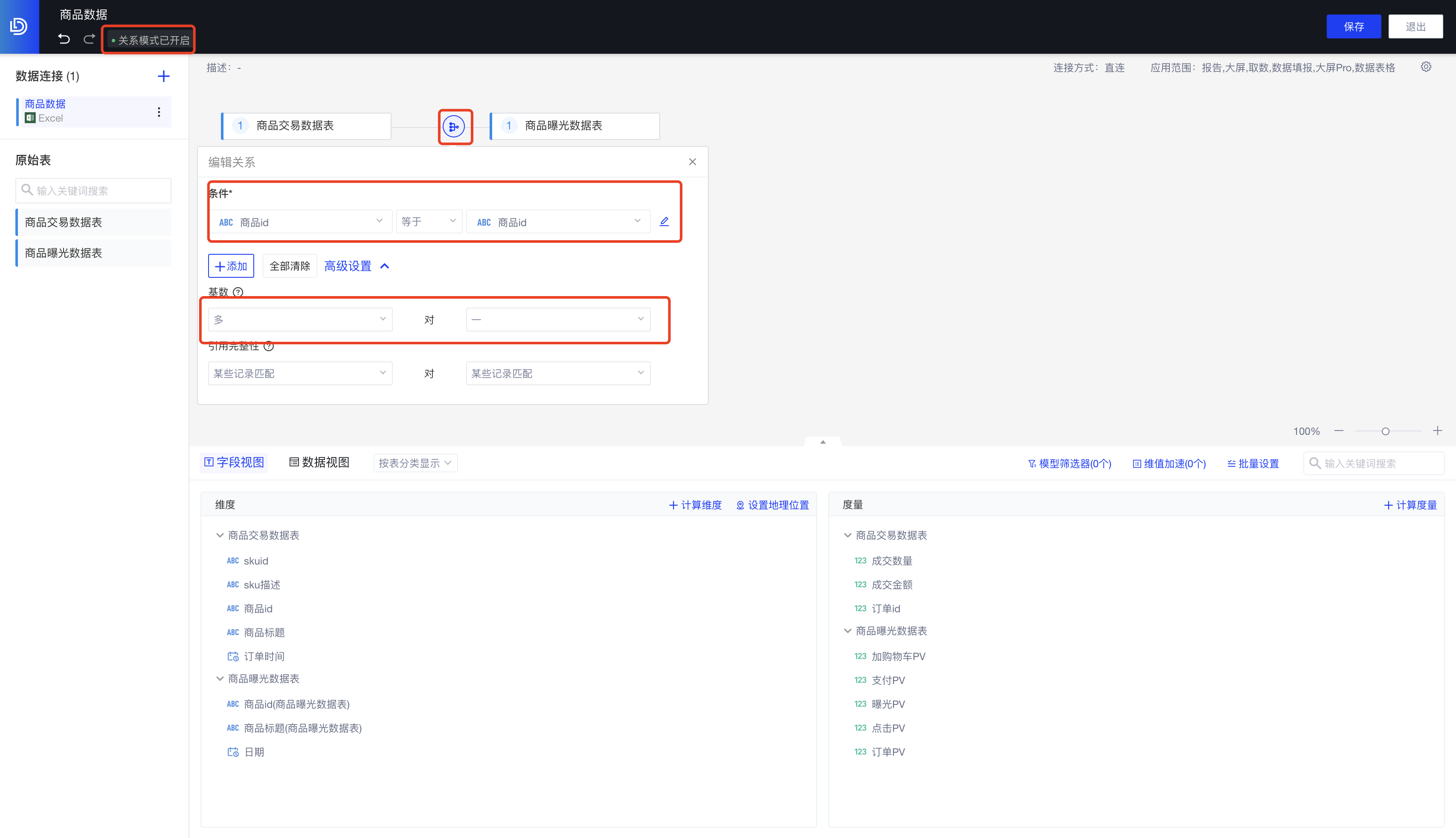 步骤2:拖入要分析的“商品交易数据表”、“商品曝光数据表”