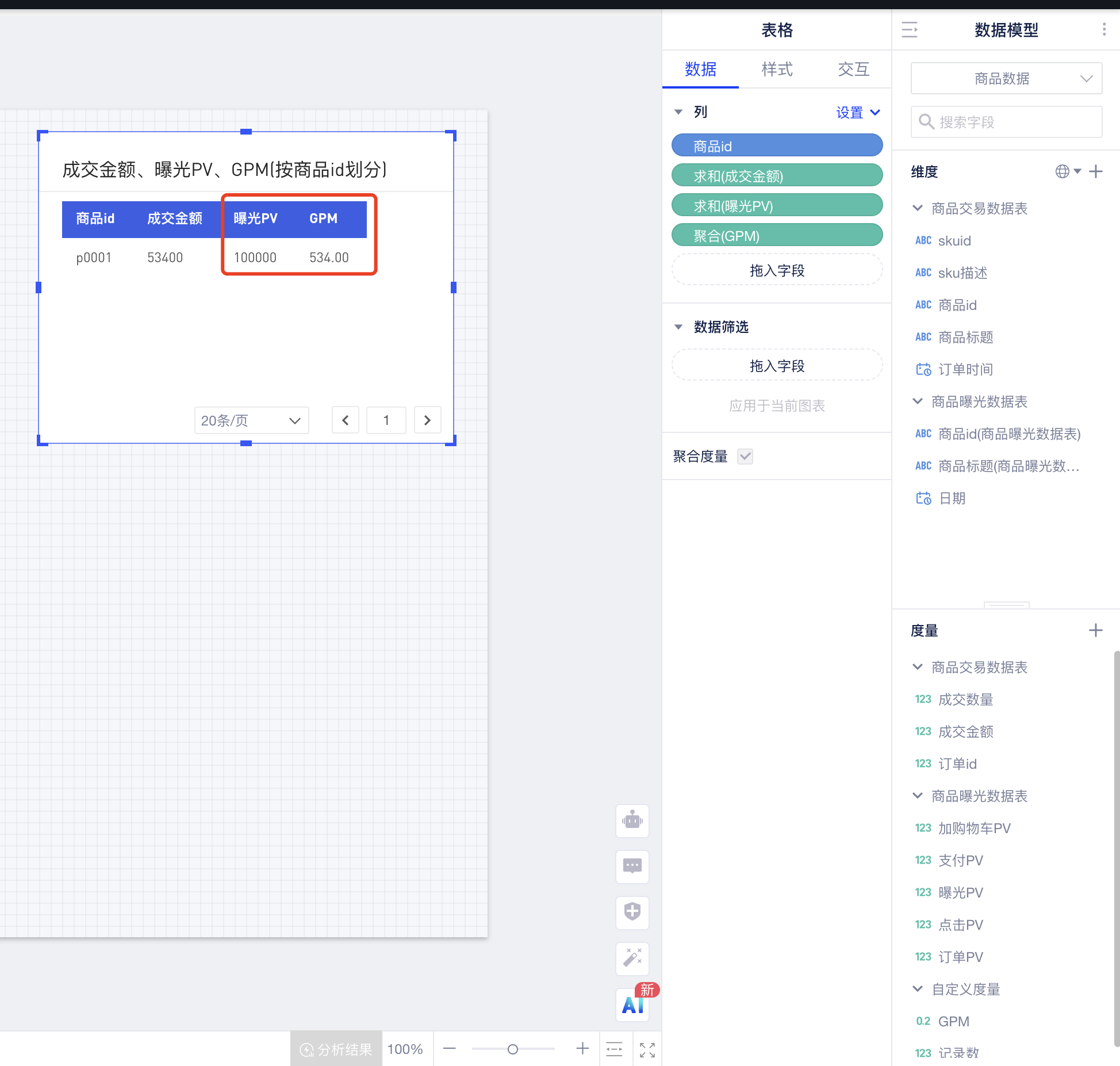 拖入商品id、成交金额、曝光PV和GPM,可以发现曝光PV指标展示的值是正确的,未发生数据膨胀,由此得到了正确的GPM: