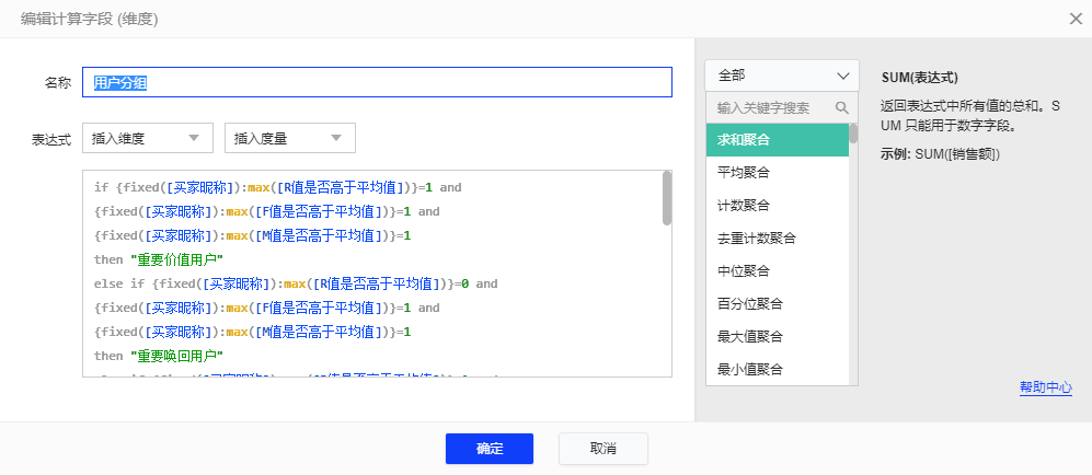 于是,我们需要建立R\F\M的平均值字段,并判断的用户的R\F\M值是否大于均值,示例表达式如下: