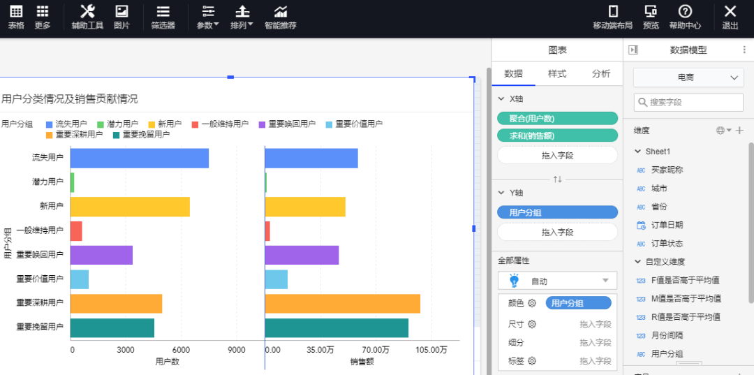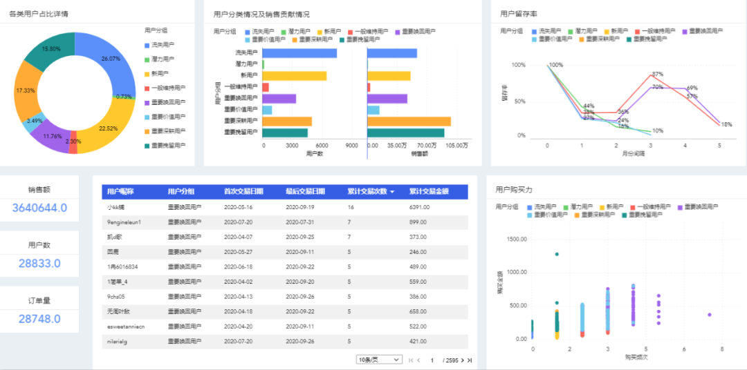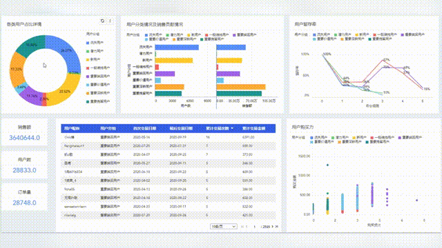 (3)设置3个指标卡,分别用于展示销售额、用户数和订单量;再将简化RFM模型表格插入。如果想进一步挖掘数据价值,可以考虑再加上「用户留存率」和「用户购买力」两张表,如下: