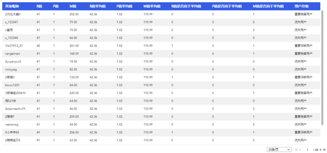至此用户分组工作完成,在画布中新建一个表格,将前文中创建的计算字段依次拖入,可以看到每一位用户都有了属于自己的RFM标签。